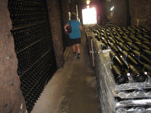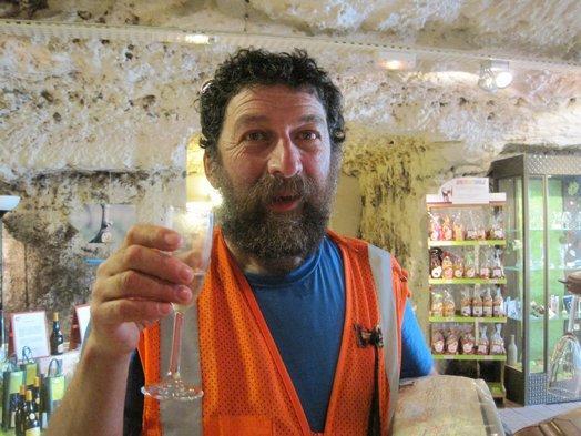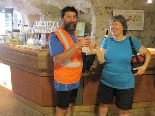 Leaving Tours, we now again proceeded along the Loire, methodically pedalling away on the dedicated bikeway. Trailside poster boards highlighted various aspects of the Loire cycle way, and in this region again, wineries are the major thing. Up in the hills on both sides of the river, our maps show one after another after another. The poster boards particularly recommended the co-op wine cave at Montlouis, which has a (brief self-guided) tour and free tasting.