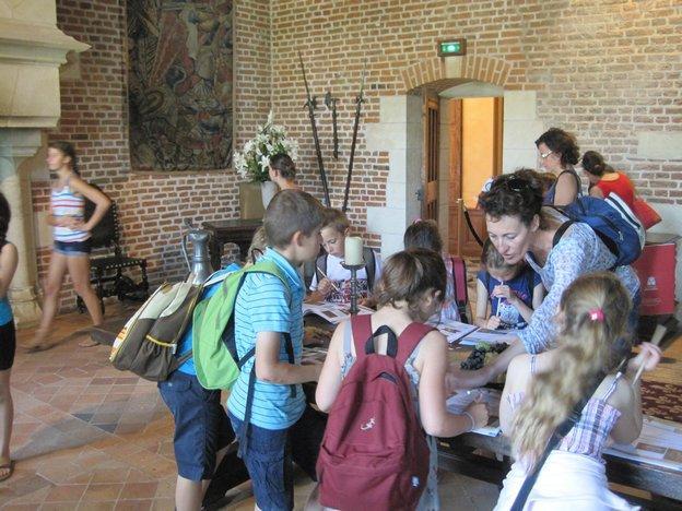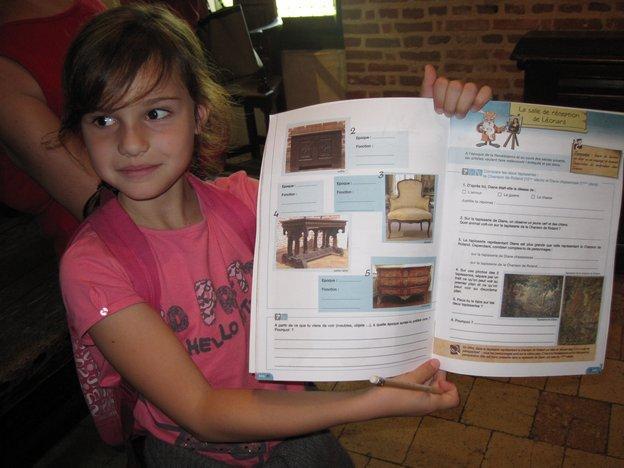 Each had a workbook with way tougher questions than I could ever answer. In sthis example, the kids are asked the epoque and function of furniture pieces.