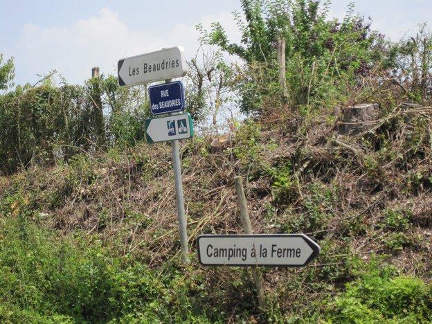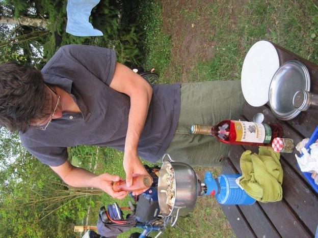 We found the camping at Huisseau sur Cosson and also Pierre and Sophie! Here Pierre (in a scene reminiscent of that one with the olive in the original Mash movie) pulls not only a pepper grinder but also a bottle of Bordeaux wine from his pack.