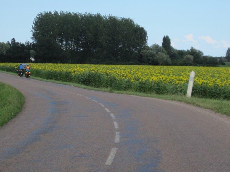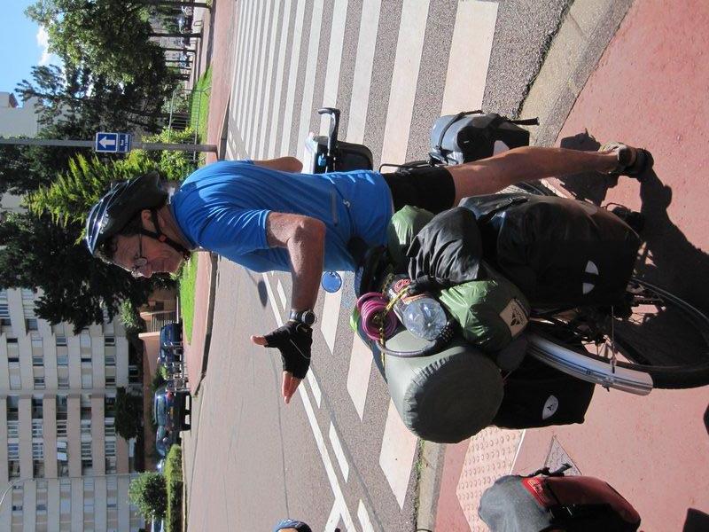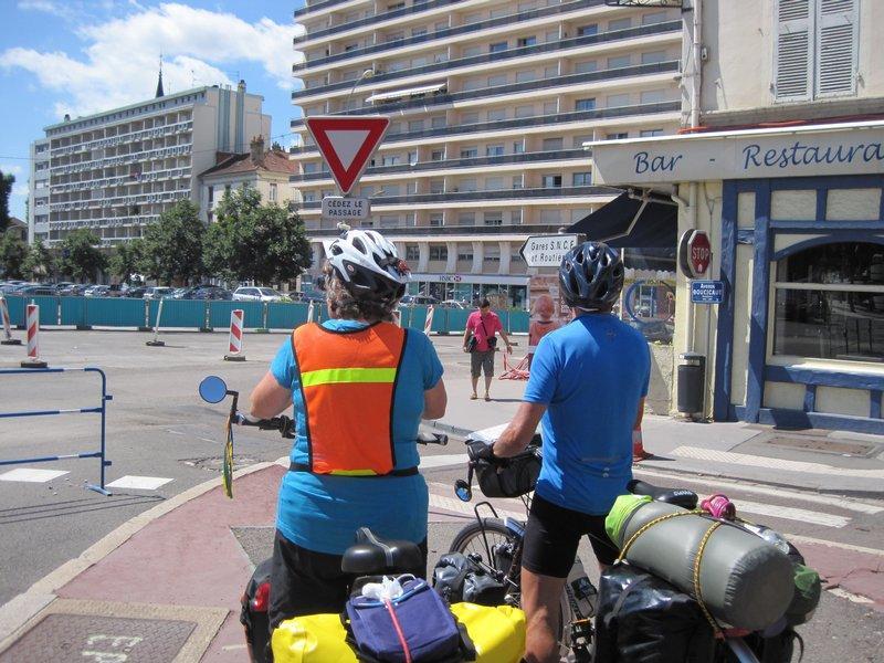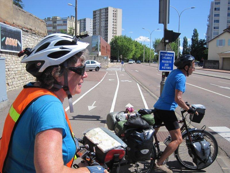 The idyllic field and canal pedal came to a crashing halt as the EV6 dumped us unceremoniously onto streets at the edge of Chalon. We puzzled for a bit, talked to a lady with a nice white Samoyed, and had sort of formed a plan when around the corner came another touring cyclist. This was Jo Aumont, who had left his house south of Nantes sixteen days ago, and was headed for Basel and later Donaueschingen. We immediately joined forces to puzzle out the way through Chalon. Since Jo is French, he of course had the ability to engage passers by in extended discussions about how to go. Still it was not easy, and we found ourselves touring quite a few urban streets (some twice!).