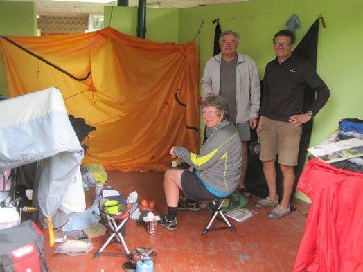 Heavy rain came again in the night and early morning and continued to threaten. So we dragged our wet fly, and cooking gear under shelter in the sanitary block. When they woke up, Jo and Marc joined us, creating an authentic Everest base camp appearance: