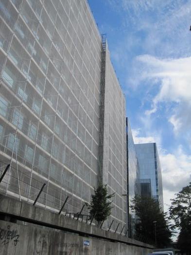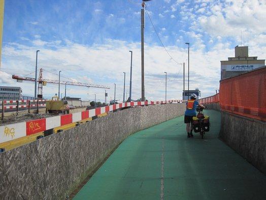 The passarelle landed us in Germany, but just North of the Swiss border on the north side of the Rhine. We had been advised to circle a building called the Rhine Centre to find the tourist information on that side, but we did not spot the office. Instead we passed through a cluttered, under construction, messy area with cars slowly passing some sort of casual checkpoint. I figured it was the parking exit for the Rhine Centre, but in fact it was the Swiss border!