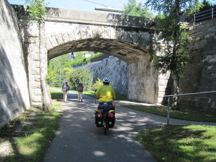 This time, because of the wind, we did more slogging and less looking. That way we did make it (to third base - Ingolstadt). Once in town, to find the camping we followed the river. We could see that we had to pass five bridges. Normally, with a big city, a bridge means fast moving traffic and problems for the cyclist. Not so here! The cycle path (there is always a cycle path!) simply went under each bridge. We arrived at the campingplatz with barely a feather ruffled. Any feather ruffling came when we got the price, 22.50 Euros for a patch of grass!