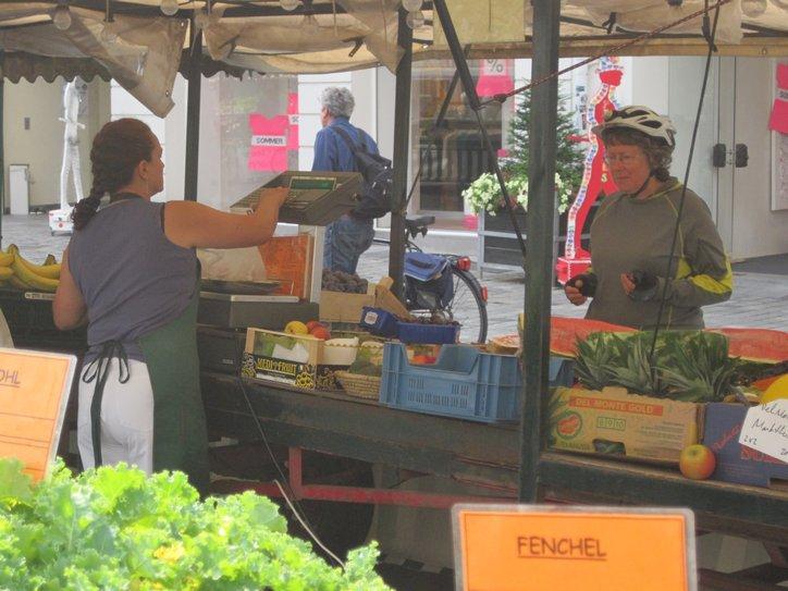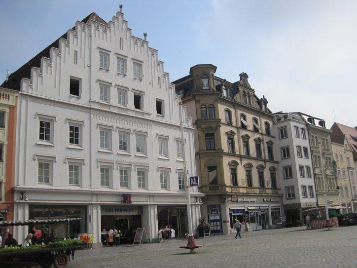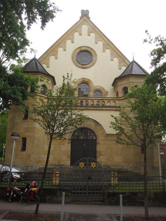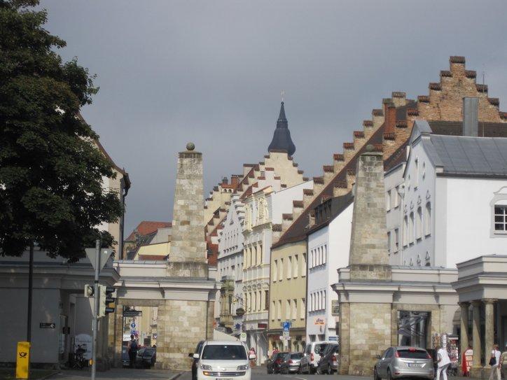 We had picked up a brochure describing what there was to see in Straubing from the camping reception. There were at least 20 structures from around 1300-1500, plus a daily vegetable market. So we detoured into town. Actually another main thing we wanted to visit was the synagogue. The Jews had been driven out of town in 1442 by Duke Albrecht III and did not return until the 19th century. The synagogue was built in 1907 and is the only one in lower Bavaria.