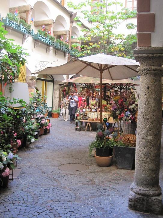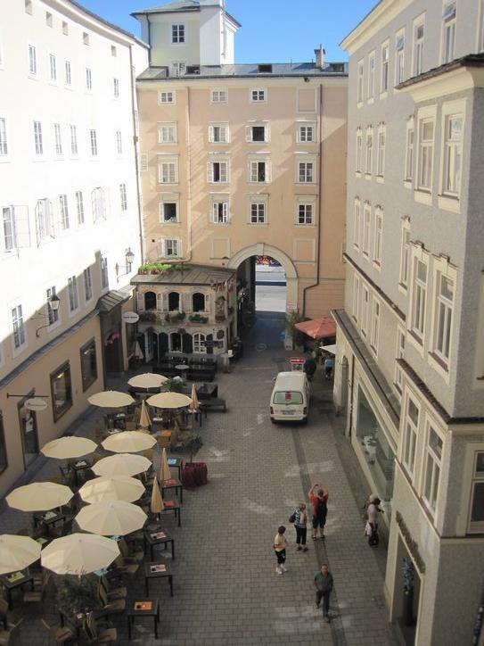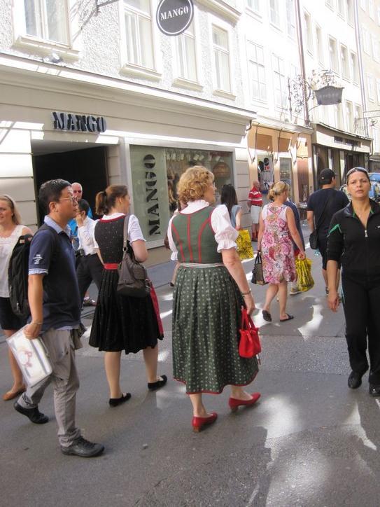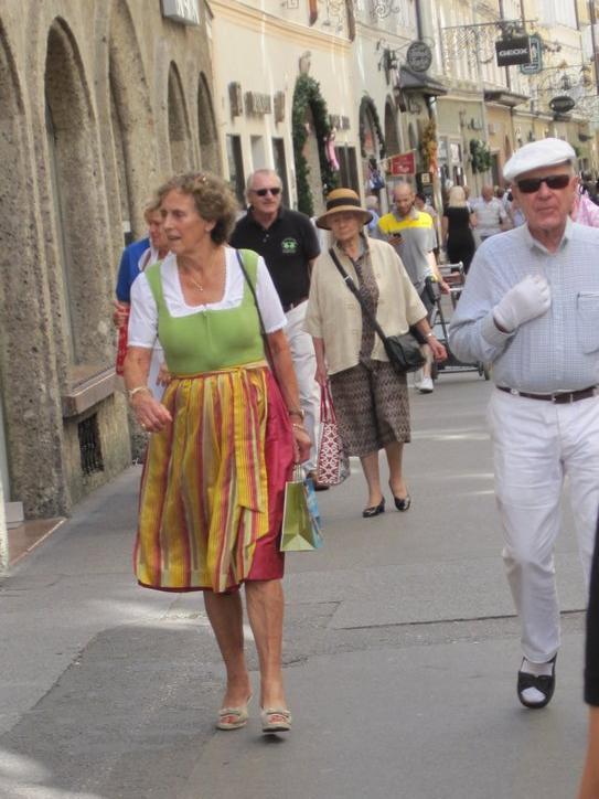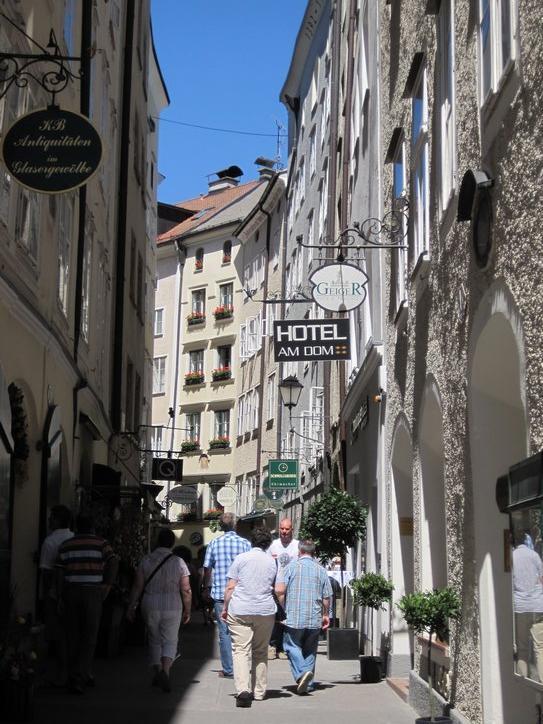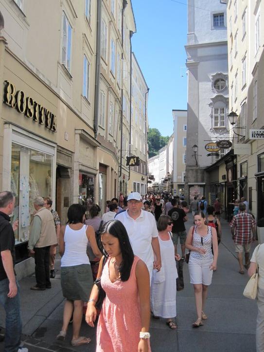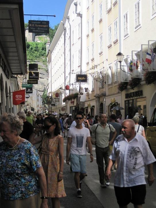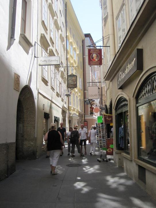 A Salzburg street scene. As we left the dinner concert we got spun around by hoards of people in evening dress, and finally trapped in a square with no exit. A kindly local lead us through some passageways to freedom. It turns out we had run into the end of a premiere of La Boheme, with dignitaries from all over present (with their body guards and entourages). We often walk into things we have no idea about!