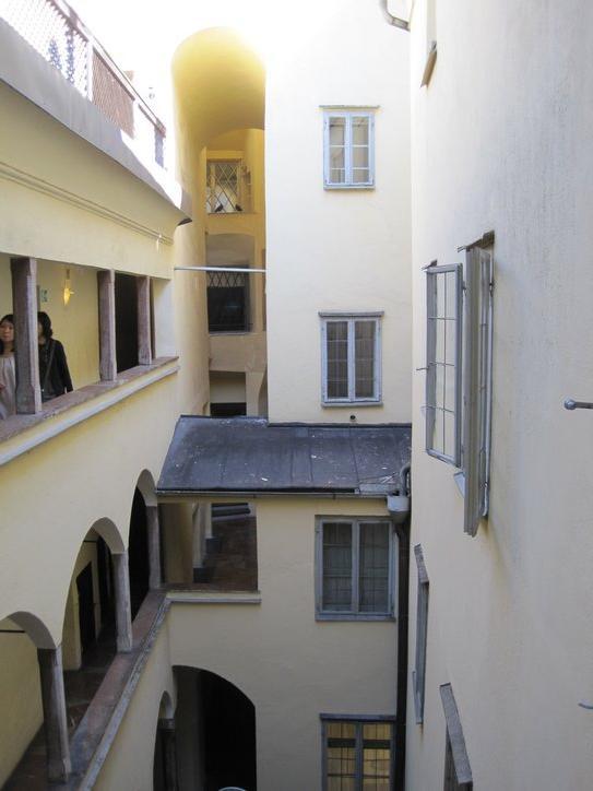 Also fascinating were the views from his windows. Some are unchanged, being elegant buildings and courtyards, and some are from the present day, like a market in the street below.