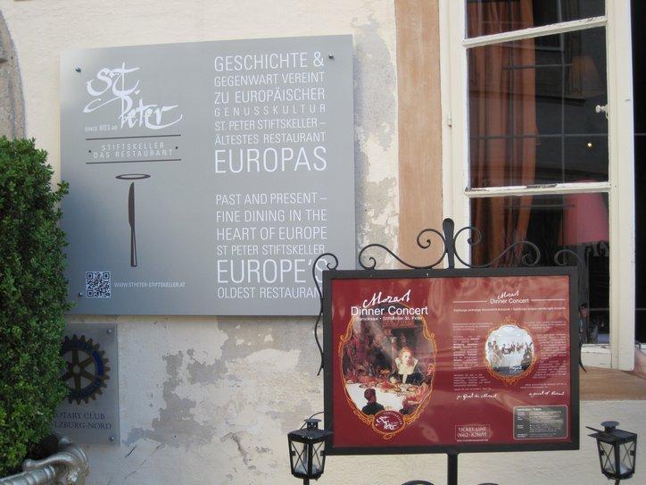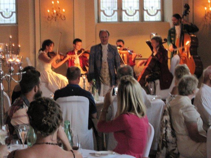 The second event was a dinner/concert in the “Baroque Room” of St. Peter monastery. The room is part of Stiftskeller St. Peter, claimed to be the oldest restaurant in Central Europe, first mentioned in 803. The performance had two violins, a viola, and a bass with a tenor and a soprano, doing selections from Mozart operas Don Giovanni, Figaro,and The Magic Flute, plus Eine kleine Nachtmusik. This was between courses of an elegant meal. The meal and the costumes of the performers were taken from the 18th century, Mozart's time.