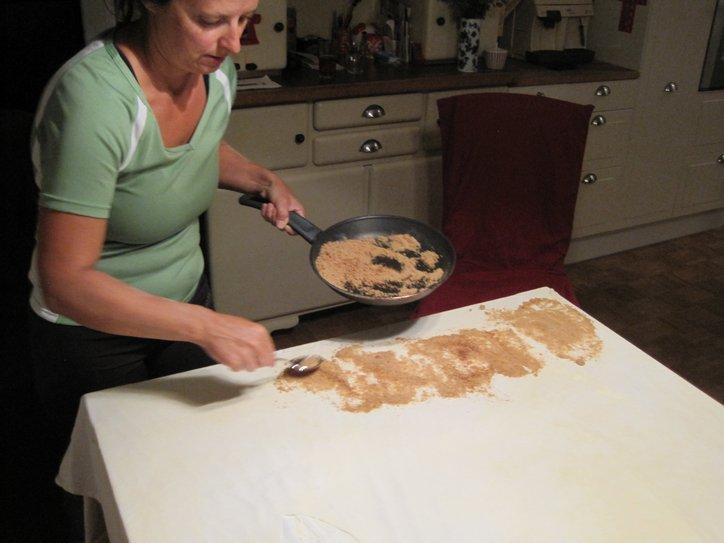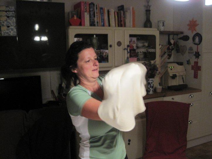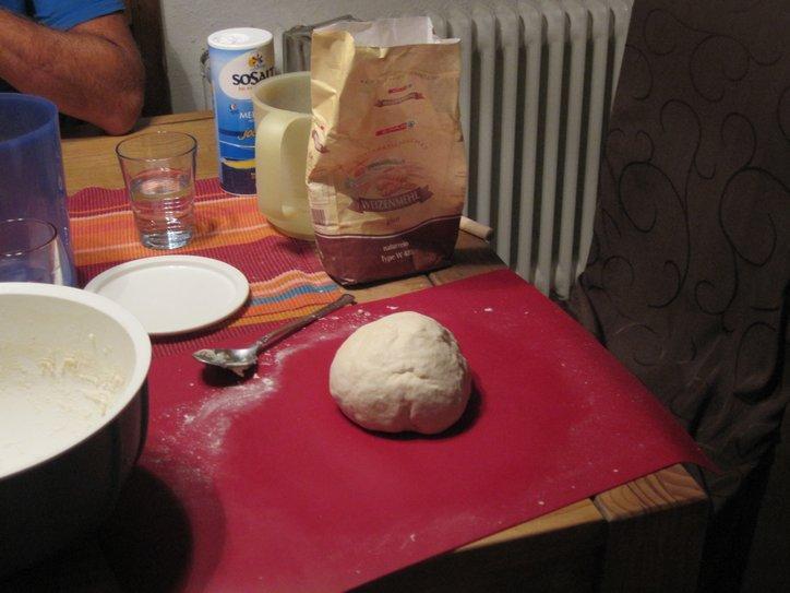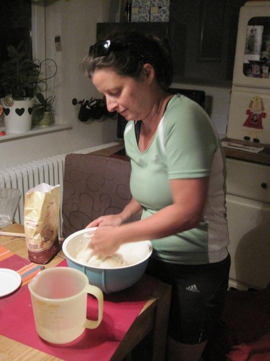 So Birgit got out her table cloth, and started to mix flour, water, oil, and salt by hand. She did not measure these ingredients, of course, but just put in the right amount. She then kneaded the dough for the right amount of time, to the right consistency. (The kneading time was a lot longer than I would have thought.)