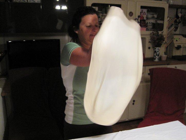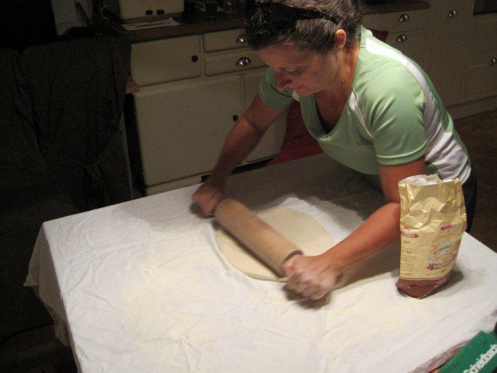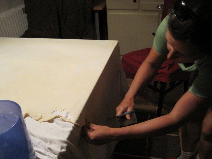 Next came the impossible trick, one that sometimes does not even work out for her. The table cloth was floured and the dough (which had rested for about 20 minutes) was rolled with a rolling pin to something about 1/4 inch thick. Then it was picked up and stretched across the arms, in a way that I wish I had a video of. When finally the dough was just starting to tear because of thinness, it was put down on the table cloth. It was then pulled further, to over the edges of the table.