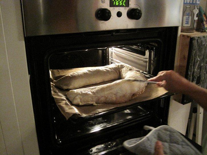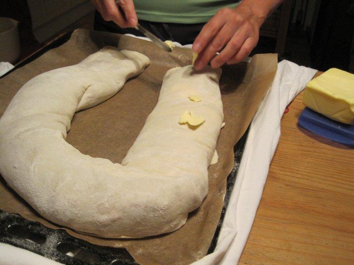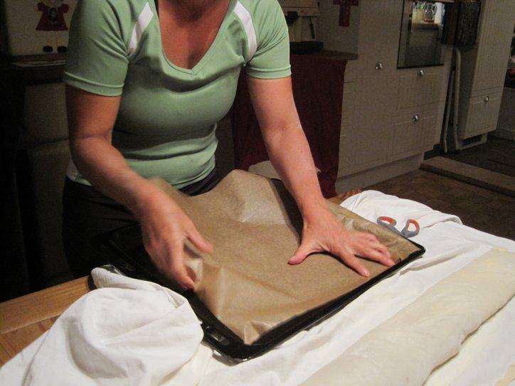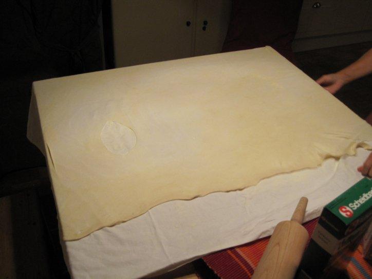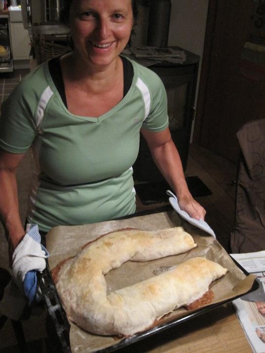The table cloth was then lifted, so as to roll the dough around the filling, creating a long snake. The snake went onto a baking pan lined with parchment paper, and into the oven it went.