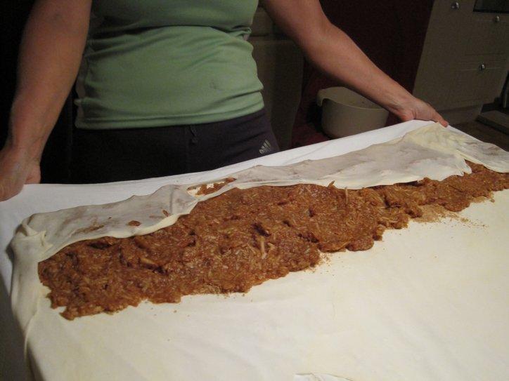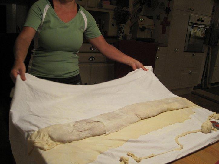 Some years ago PBS (US public TV) aired a series called "The Spice of Life". The series took on one spice per episode, tracing its origins, politics, and uses in various foods. When the subject came around to cinnamon the show had a segment showing a lady making apple strudel in Austria. What struck me at the time was the way the dough was stretched to a paper thinness to the size of a table top, and then it was rolled by lifting the table cloth.