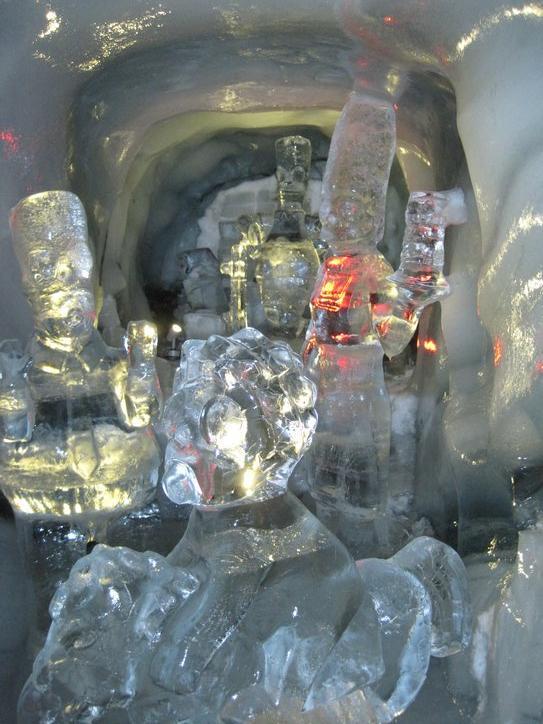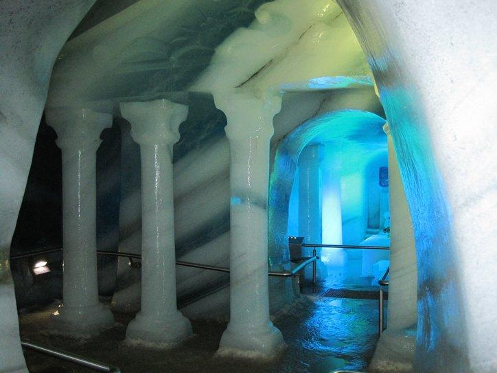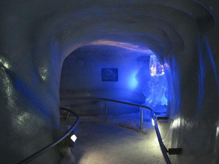 The cable car station gives access to the glacier behind the steep south face that it ascends. On the glacier, it is possible to ski and also to set off for the true summit. If you are double tough, you can reach that summit (with a guide and ropes) in a couple of hours. If you are not tough, you can walk to a spot where a tunnel leading to a series of caves has been carved into the heart of the glacier. This is the Ice Palace, where a display of ice carvings has been made. Right now the display features ancient Egypt. Go figure.