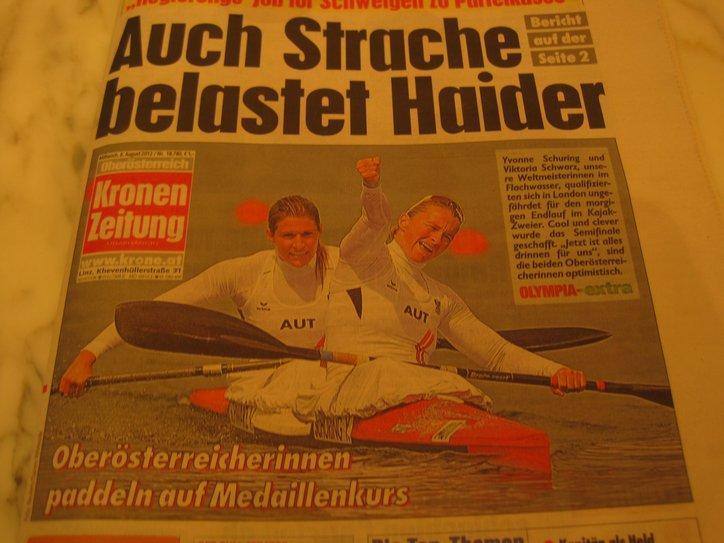 In England, I photographed some newspaper front pages, because it is interesting to see what news is covered and how it is presented. In France, while I could understand the stories, they all seemed too boring to even waste "film" on. In the German speaking countries, I have no idea what the papers are all about. But I did see this: We won a medal in paddling!