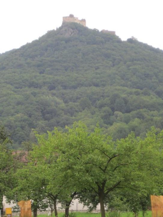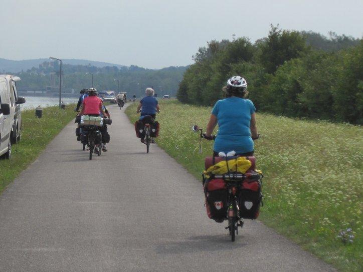 We had used a lot of time in Melk, but with the easy cycling were not too worried about chalking up some distance too. We came around to Rossatz where there is some camping, about 5:45, and found Karl already installed there. So Dodie went off to register while I set up the tent. I had it up when she returned to report that there was no wifi, that it was pretty much a bike ride from the tent site to the toilet, and that the man seemed to want a 15 euro deposit for the toilet key, plus a total price of 17.50 euros. We tore down the tent and moved on! (Sorry, Karl).