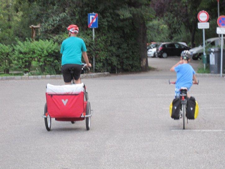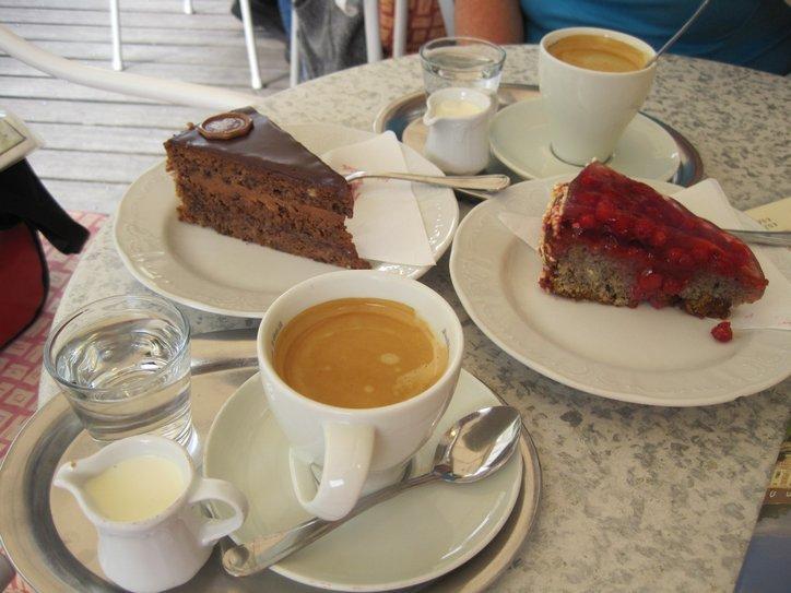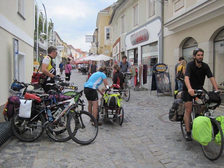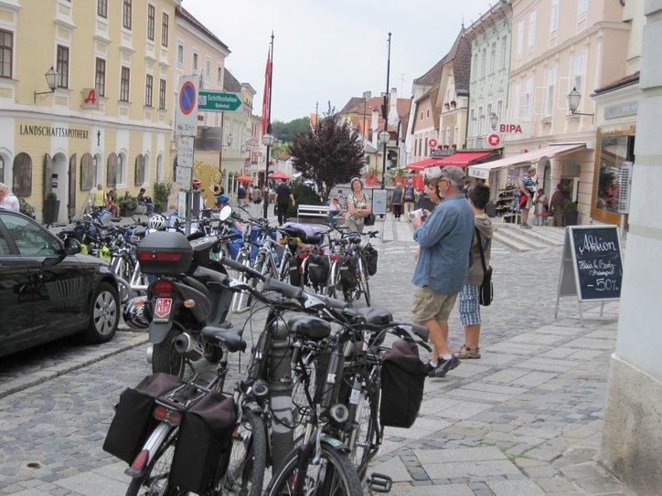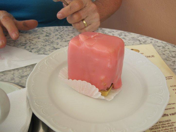 The narrow streets are clogged with cycle tourists. And the bakeries! Actually we just stopped at one, the first we came to. We found that we are now firmly in Viennese torte territory. A torte is a mostly flourless, moist, decadent cake.