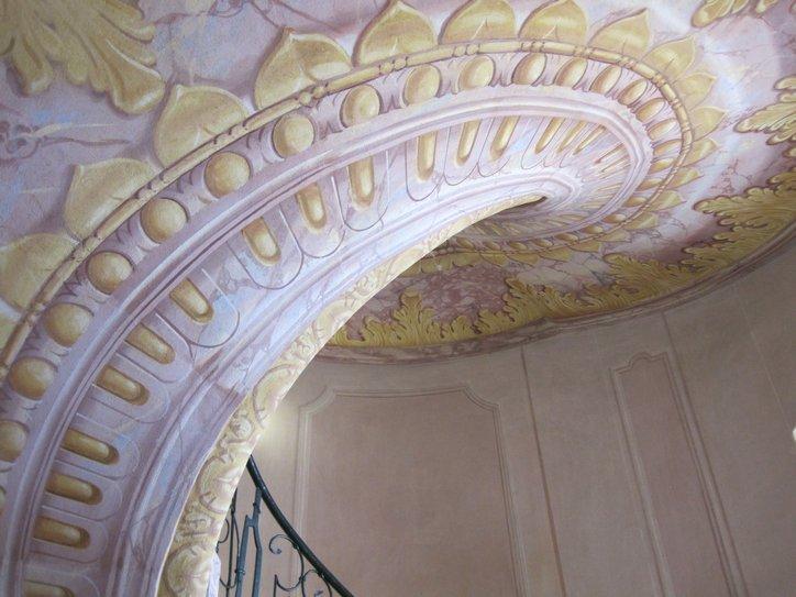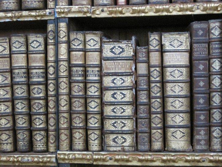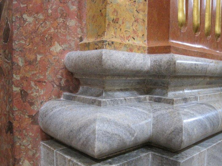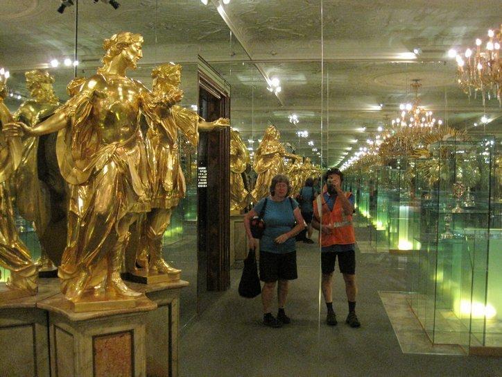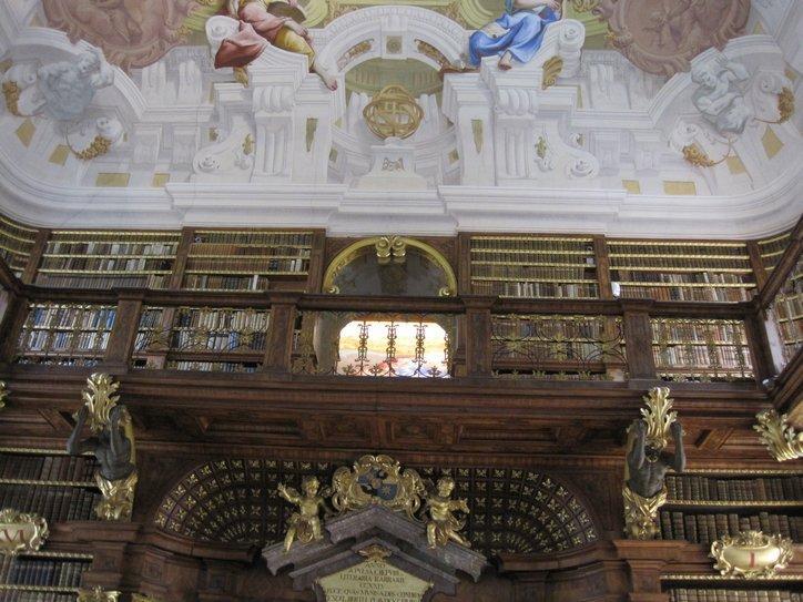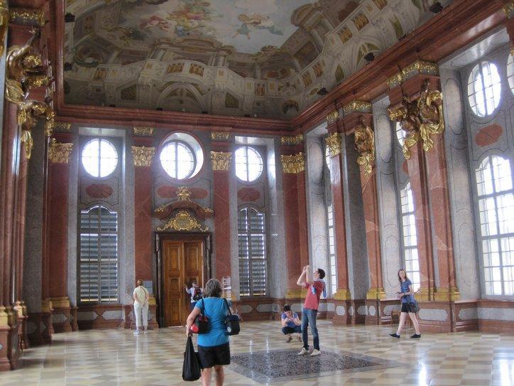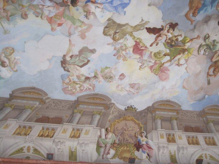 The marble hall gave a preview of the over the top marble and painting decor that we would next see in the library and church. The library, then, had floor to ceiling shelves of similarly bound ancient texts, and crazily colourful and complicated painting on the ceilings. In the library, no photos were allowed. so I took some anyway. A docent came over to remind me about the rule (in German). In English I said I could understand that flash could damage the books, but what was the problem with ambient light shots. The German reply was long and of course I didn't understand it. However the word "Verbotten" did figure an awful lot!