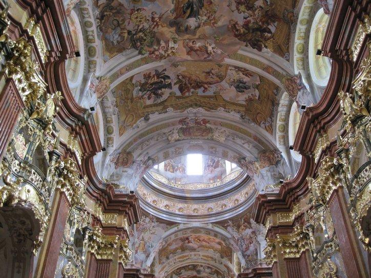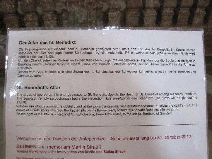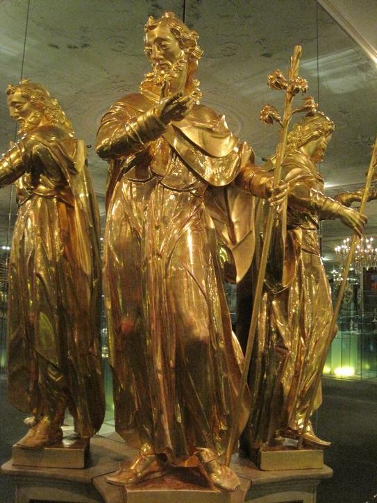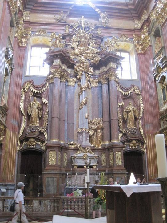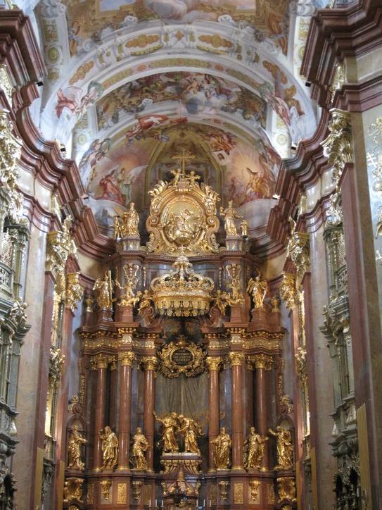 The church section was the crowning glory of the building, with the kind of elaborate decoration we have come to expect in cathedrals like this. In this one though, gold figured a lot - more than others that may have specialized in pink cherubs, or something. It helps to actually know what the various depictions are, rather than just be overwhelmed by the general impression. So read the description of St Benedict's altar, for example.