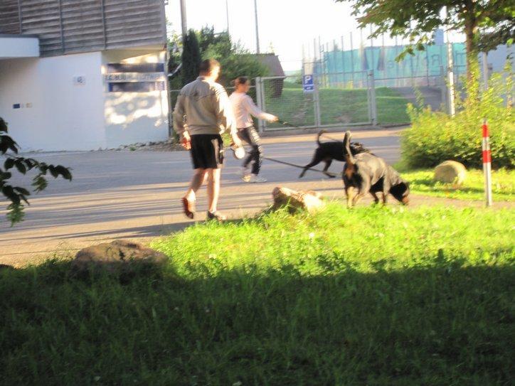 Last night, we were aware of a fair amount of barking from the Rottweiler dogs lodged around the arena and the festplatz, However, they were no problem and did not disturb us. In the early morning, our wild camp became a hub for dogs being walked. That made it easy to flag down an owner and ask for details of what was going on. What was going on was the world Rottweiler championships and show! The man said there were 500 dogs in attendance. Most of them walked by our tent, and we saw they were glad when we packed up, because it gave them an extra place to pee.