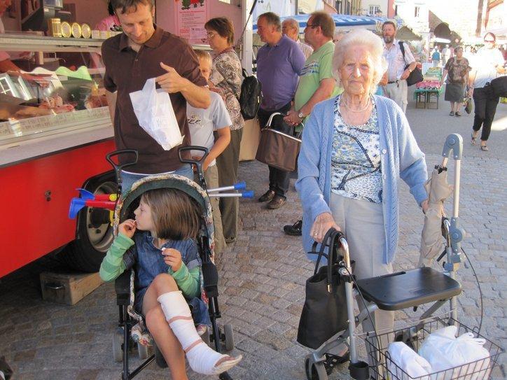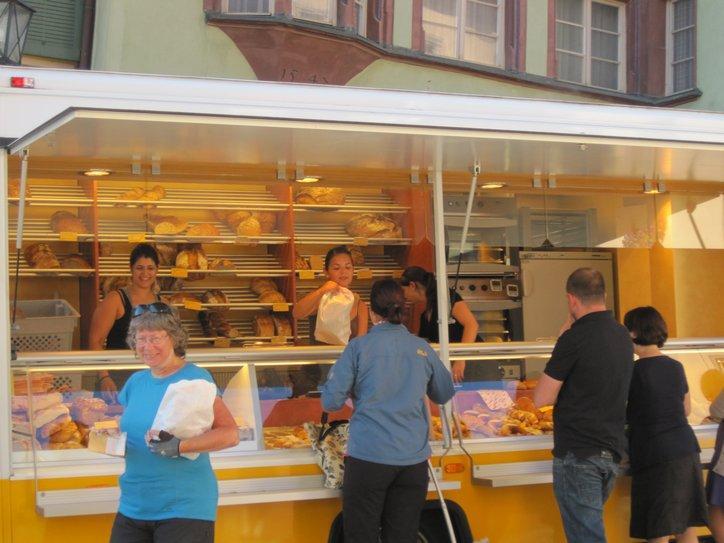 Dodie likes trying to make her purchases in German, getting the vendors to carefully explain the numbers involved in the amount of the sale and in the change.