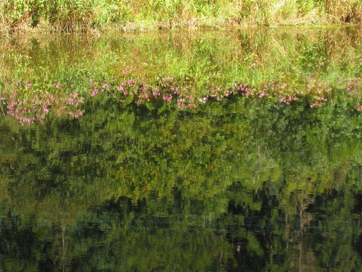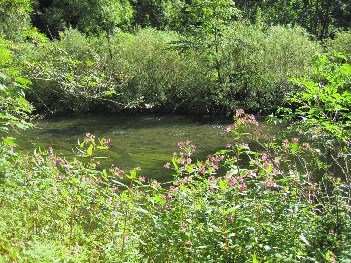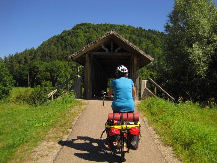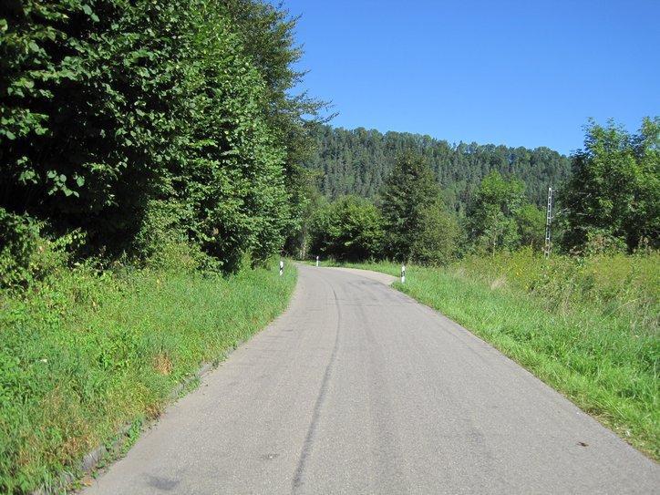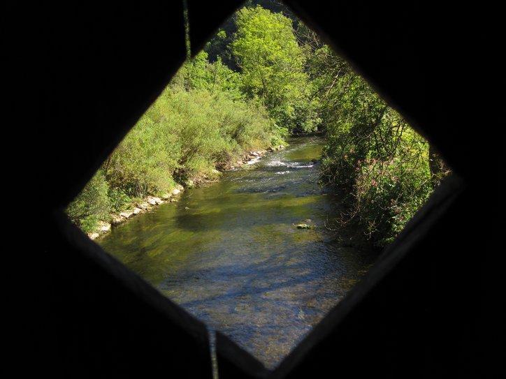 When we finally left Rottweil we were also starting our run down the Neckar. By taking a bit of a shortcut, we had jumped in at Rottweil, rather than at Schwenningen. Still, this is pretty much the start of the river. We were eager to see the darn river, but the marked path did not take us to it for a while. As with the Donau (or any river) the early stages are not so impressive. The great river will be a ditch or a stream at first. We caught the Neckar at the “stream” stage, but still it was picturesque. I especially like the shot through a hole in one of the covered wooden bridges that span the stream in the early stages.