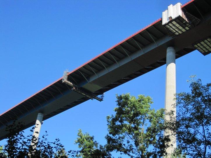 This bridge, bearing an autobahn (A road), was way up in the air. It is supported on single pylons that in no way seem able to prevent sway. So weird to cycle under it.