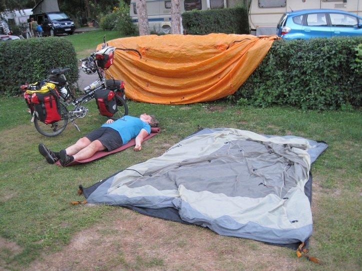 The day was hot, though the forest often provided shade. After 94 km we made it to the camping in Tubligen. Dodie lasted until we selected our tent site, then began to tremble. She pulled out a foam mat, and collapsed.