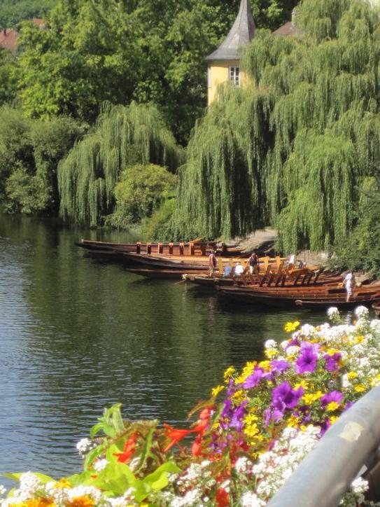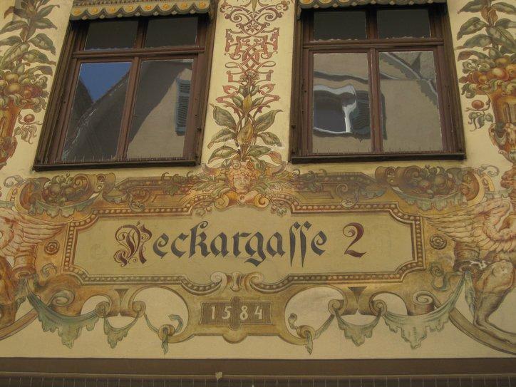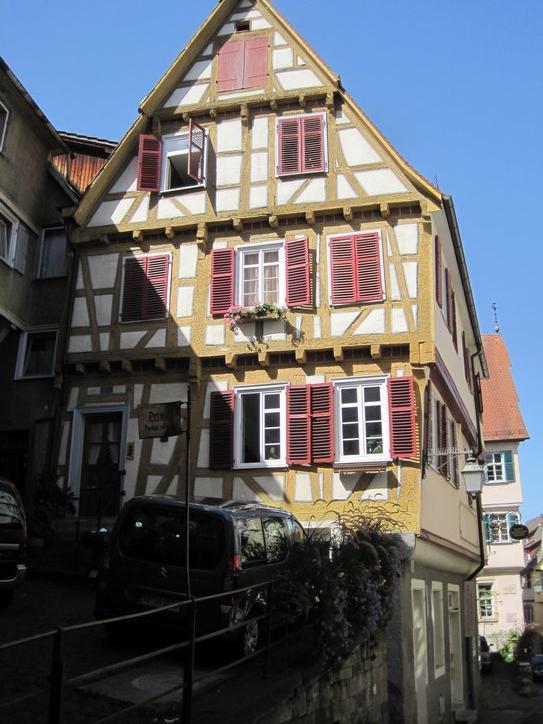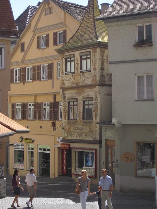 Tubingen turned out to be much like Rottweil. The old town is more extensive than those we have seen in other spots. The Rathaus square is dominated be the city hall, which dates back to 1435. It is decorated with paintings that we done in 1877. We are now a little used to seeing frescoes on the outside of buildings, but they are always impressive. Around every corner there is a view down a crooked and narrow street, looking exactly like a set for a movie.