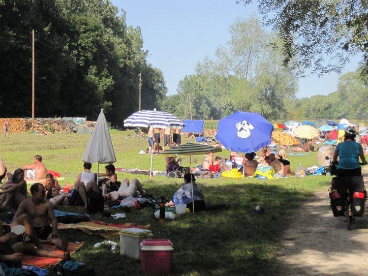 The river, of course, does remain a unifying link. Today, though, it was also a bit disconcerting. We would be going along minding our own business when the path would begin to fill with walkers in beach gear. They headed purposefully somewhere, but we would have no idea what it was all about. Then the path would widen to a parking lot, or something, and we would find ourselves in the middle of a full blown beach scene, with hoards of people. Clearly its's Sunday and very hot, but it was still a bit surprising to come upon these concentrations of people on our semi-lonely path.