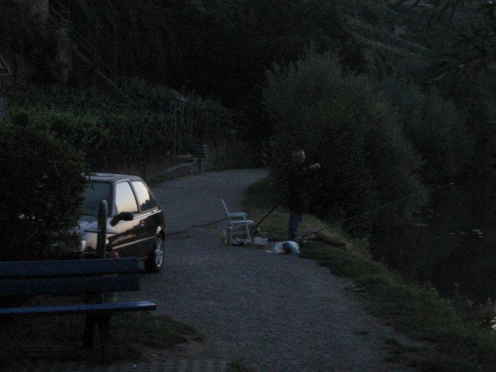 About 3 a.m. I got out to make a pee and spyed a figure sitting stock still, with two fishing rods in the water. At 5 a.m. our alarm went off, and there sat the man, unmoved. We took down the tent and went over to sit on a bench to eat our bread and cheese. The man looked at us, and gave the slightest nod.