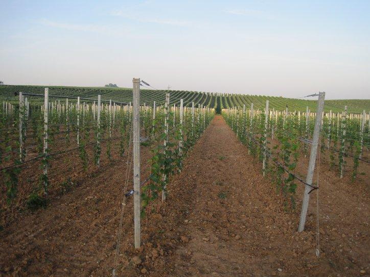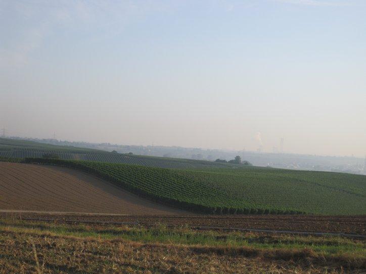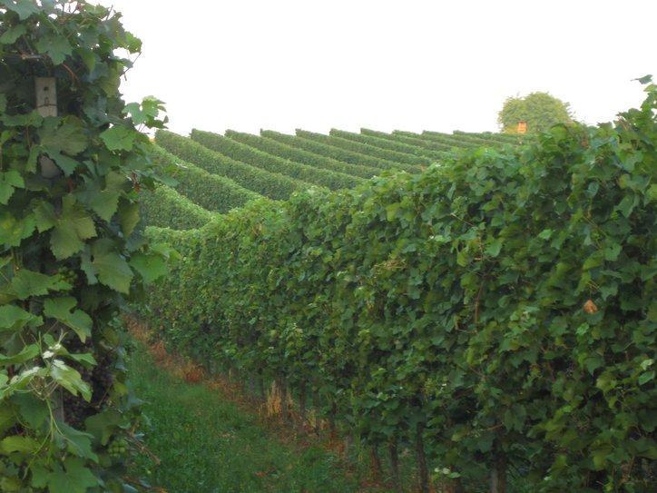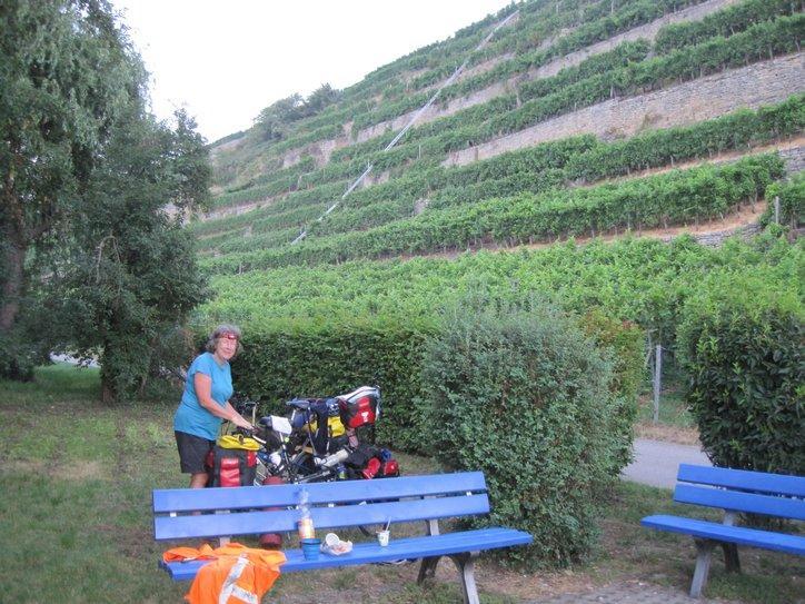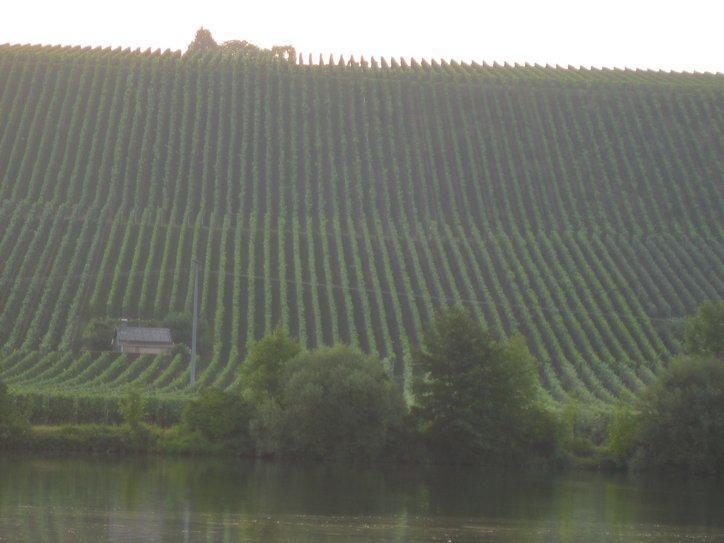 As we cycled around the next curve of the river, it looked more like a still morning lake than a potential shipping corridor. The striking feature of the terraces on the cliffs, supporting so many grape vines continued. After some distance, the cliffs subsided, but the grapes did not. Now they carpeted the land, looking from a distance like corn. On the vines nearest us hung an abundance of dark purple grapes. They looked ripe, but must not have been 100% because not a single worker was to be seen.