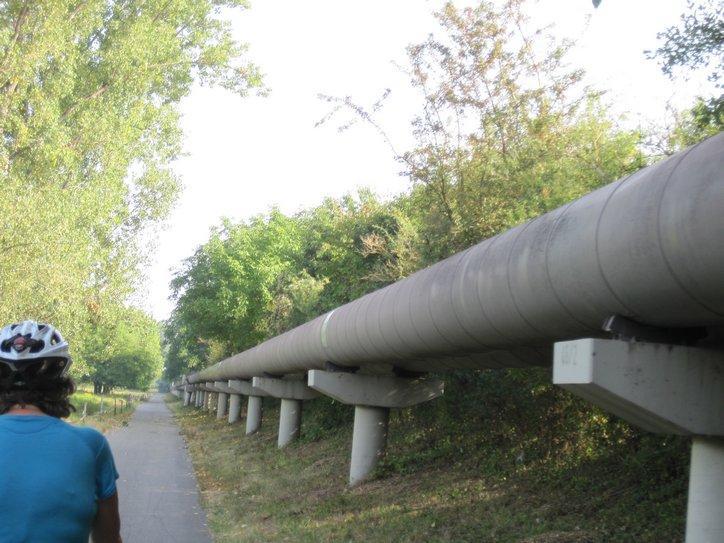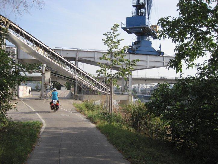The path continued as yesterday, with a mixture of lovely pavement by the river, shared way with busy traffic, by the river with industry, etc. The towns were often plain, but some had quite a few old and nice buildings. Further, we often spotted castles or ruins on surrounding hills. The net effect is not the unremitting wow of Passau to Vienna, the Loire, or the other routes we have just followed, but it still is a good adventure.