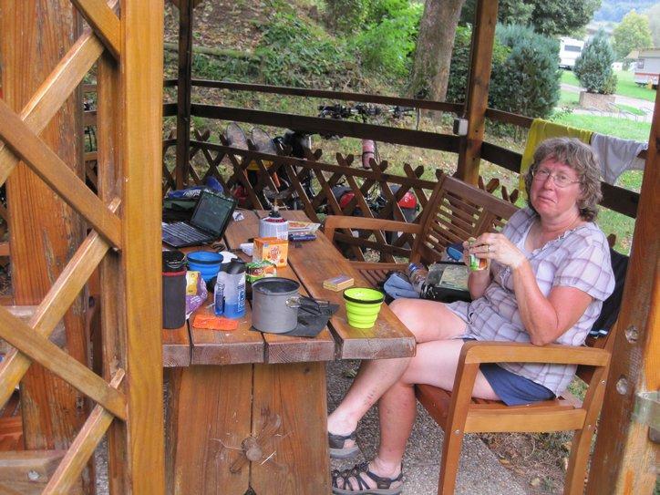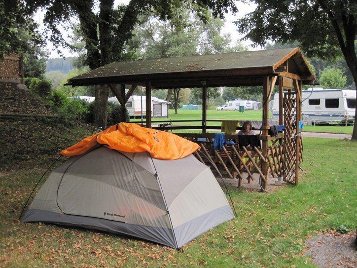 So today we took our pick of camping, and stopped (quite early in the day) at Neckargerach. The new owner of the camping (yes, by the bridge as Graeme reported) went out of his way to accommodate the two overheated Grampies. We are sitting in a gazebo, to which he has run an extension cord for us. We have washed our stuff and dried it in his drier (ok, so it’s 2.50). We have had one shower, and may soon go for another. Lots of people seem to be over swimming in the river. We could go look, but that would involve effort. Instead, we’ll stick here, and wait for another (maybe cooler) day.