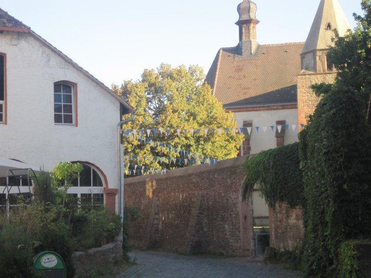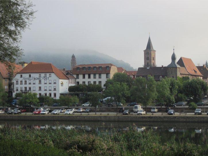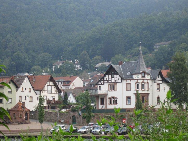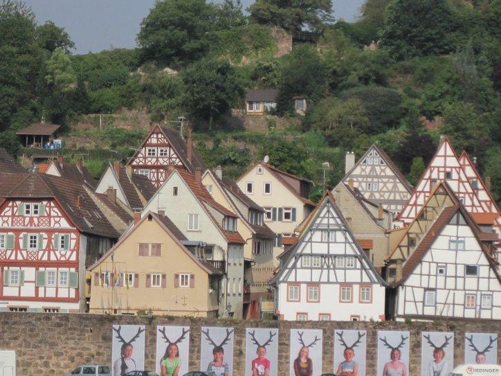 Our way continued along the river, passing Eberbach and generally following the river on shaded pathways. A special place, though is Hirschhorn. There is a pronounced loop of the river there, creating almost an island within the loop. At first we thought the neat old town would be found on this island. But that, of course, is 21st century thinking. Thirteenth century thinking puts the town on the hill overlooking the island. So as we rounded the river loop we could look over and up at the old town. Just because we have places to go and things to do, we did not cross into the town for a closer look. No problem, though, a poster display told us that we (and you) can read all about it, at www.hirschhorn.de .