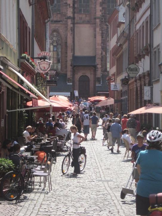 We had thought about camping near Heidelberg and sending a day exploring the city, but in the end decided on just a circular stroll walking the bikes. Down the high street, Dodie remarked that if we cast our gaze upwards, over the heads of the people, we could easily imagine that it was 500 years ago. However, if we looked straight ahead it was clearly the 21st century, with a large proportion of the tourists being from Asia.