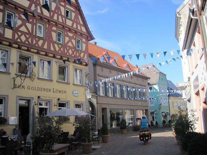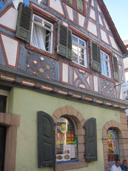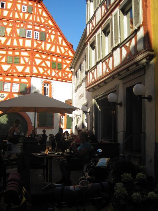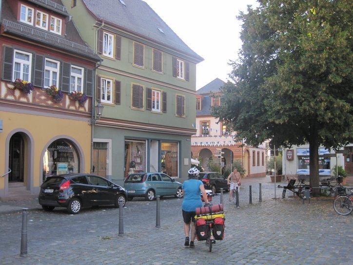 We stuck to the north (right) bank of the river for most of our approach toward the camping near Mannheim. We had no special reason for going that way, except that our map somewhat recommended this as the main route. It turned out to be a good choice, because on the right bank is Ladenburg. Ignorant as usual, we stumbled into Ladenburg old town (to the extent you can “stumble” on a bike). This old town is a little jewel, with numerous half timber design houses. We were just gawking our way through when we decided to go sit at one of the sets of outdoor tables, in front of a place with a simple name, like Ladenburg coffee house. There we sat by a house that was labelled “Built 1480”, and others of the same age. All had been completely restored, making the most pleasant possible place to sit. We ordered meals, that came quickly and were excellently prepared. And we saw the waitresses carrying some really great looking tortes and cakes to other tables. The menu even cited Sacher Torte, at 3 euros. Sadly, with evening falling and no idea when or if we would find the Mannheim camping, we gave it a miss.