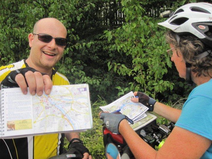 The man was Raphael, from Switzerland, near the Bodensee, and cycling from Basel to Rotterdam. He had just the right conversational ice breaker! And he was right. It turned out Dodie had put a sticker (turn right here, or something) right over the camping symbol, back home.