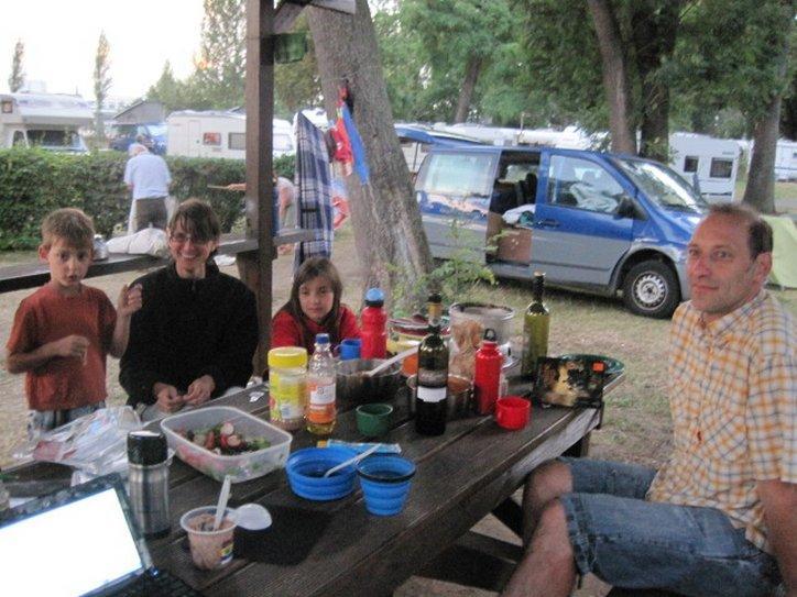 So now we are sitting at a table at the campground, with Raphael and a family with three kids – all on bikes (one Follow Me). And we are talking about .. the Usual Topics. Tomorrow – Mainz!