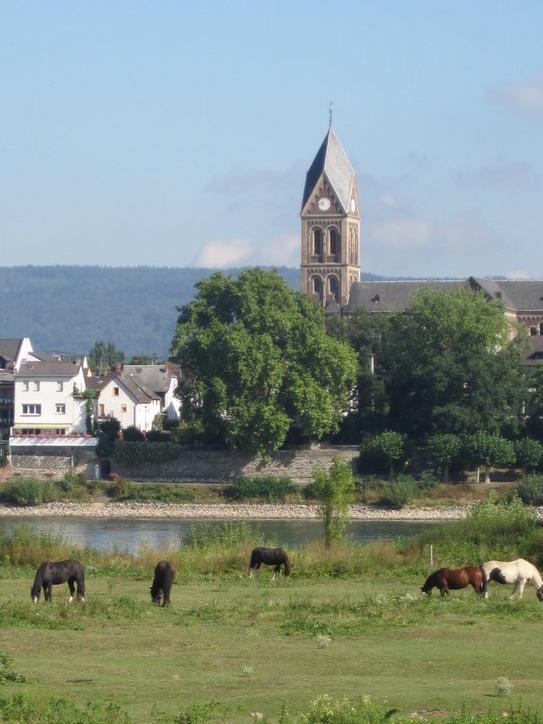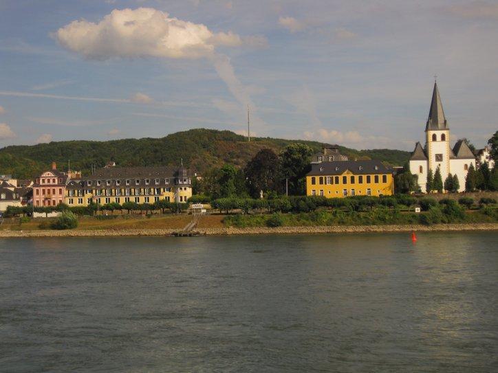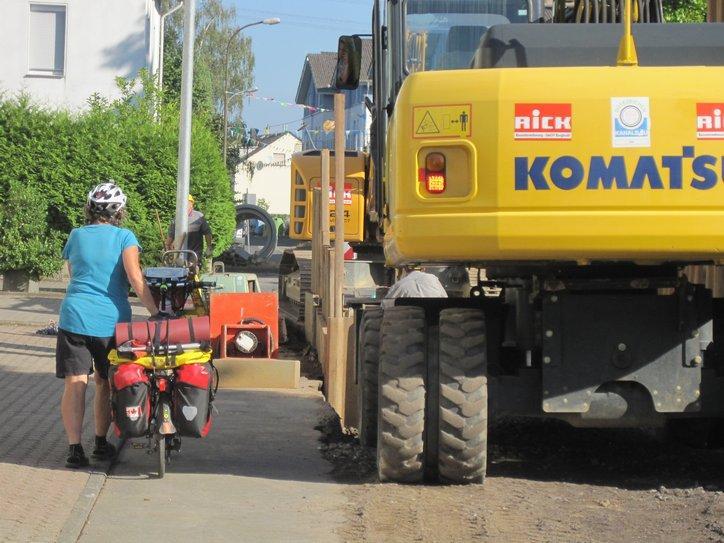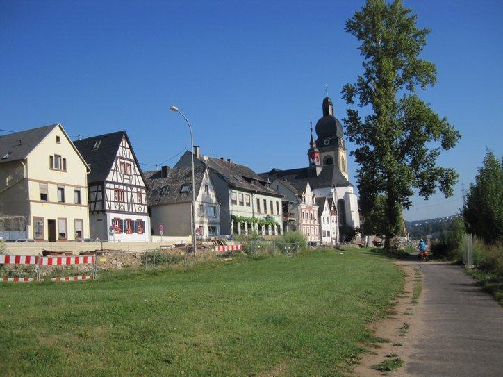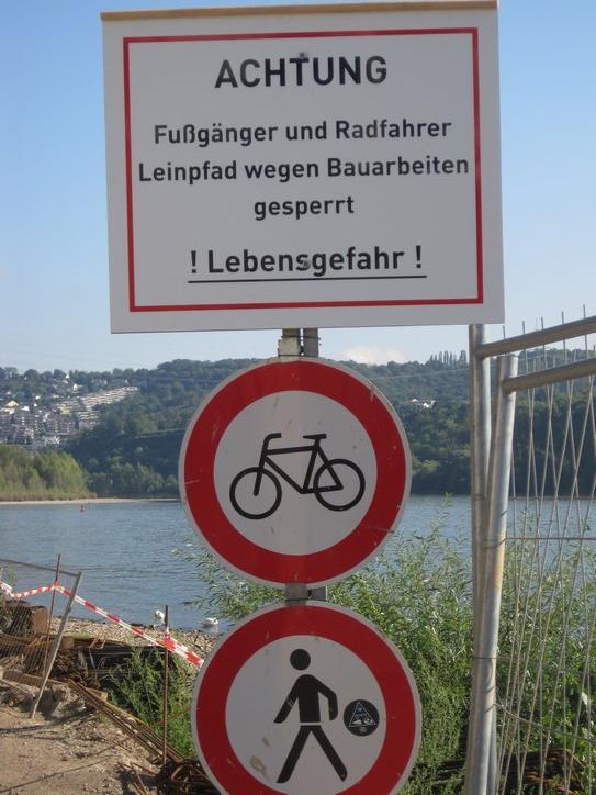 At least, we began to head down the Rhine. Pretty much immediately, at Wallersheim, we ran into construction. “Lebensgefahr” (risk of death) said the signs, do not pass here. Yeah, sure, we thought at first, but soon saw they were serious. So we circled around, getting a “free” tour of this small suburban village, before returning to the bank of the Rhine.
