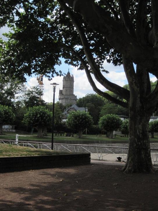 The Rhine offered up a couple more castles before Bonn: a ruin on one hill, and Schloss Drachenburg on the other. Drachenburg, in particular, has true fairy tale design.