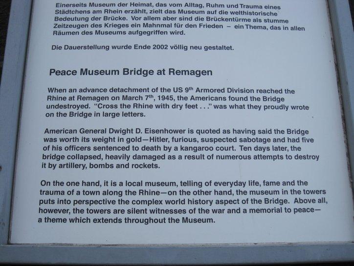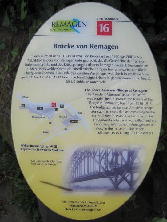 One special point of interest today was at Remagen. The bridge there had been captured by the Americans I 1945 after they found it still standing. It was the last standing bridge over the Rhine. The Wehrmacht continued to try to destroy it, and eventually succeeded. It collapsed despite the Americans’ attempts to shore it up.