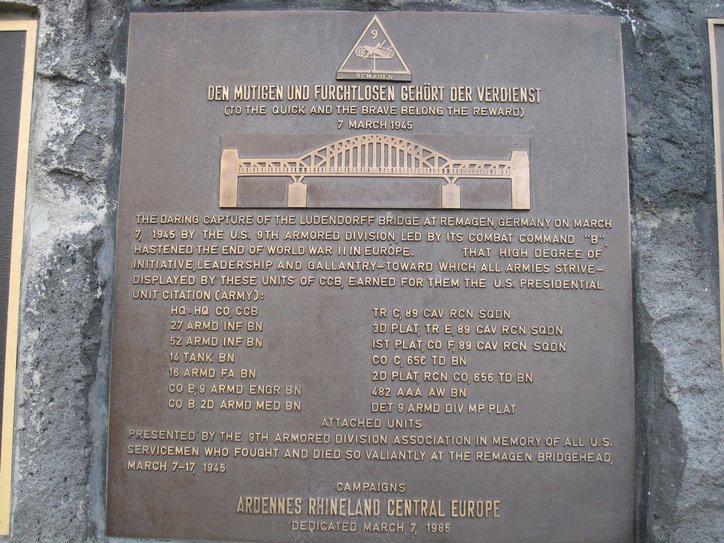 The bridge was a symbolic victory at the time and later was the subject of a book and movie. What remains now are two large bridge towers on each side, part of the railroadway behind the towers and a very short projection of some bridge part from the left bank. In the left bank towers are a museum, and memorial plaques placed there by U.S. armed forces units in later years.
