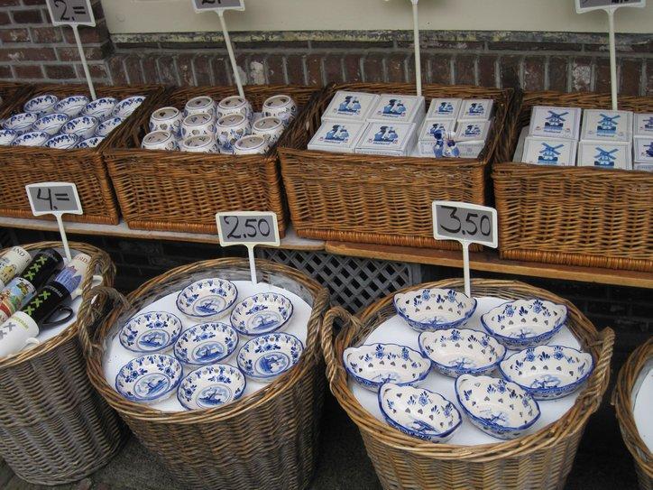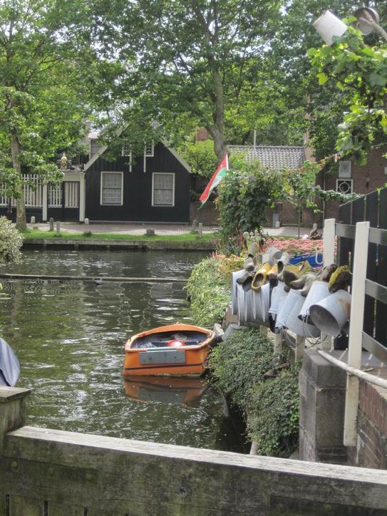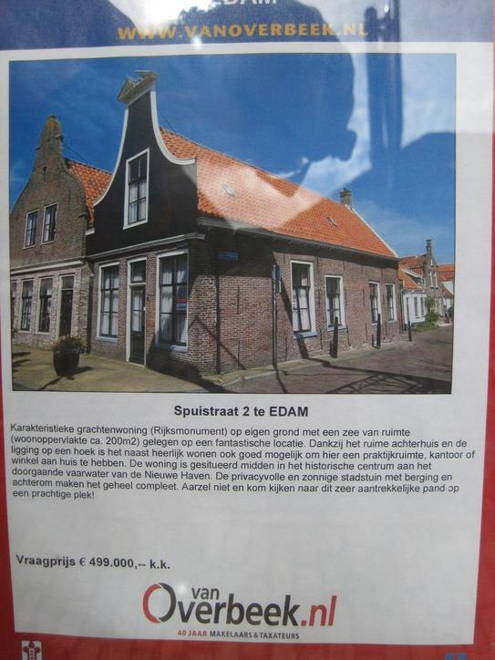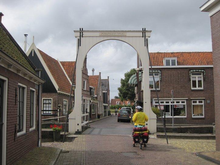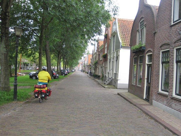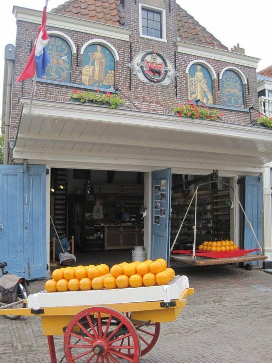 We continued along the dike, all the way to Edam. Edam turned out to be quite a small town, and approaching it was a pleasant matter of riding down a cobbled road beside a canal, with no intimidating traffic. At the centre of town, a modest intersection of quite narrow streets, stands the first shop selling souvenirs that we have encountered in Netherlands. They had wooden shoes, little windmills, and some blue and white dishes. We could buy and take along none of this, of course, but I did get a sticker with a cow on it and saying “Edam”!