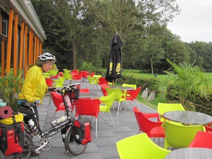 We downed the last of our cherry tomatoes and some cookies, and headed for a town – Avenhorn. There we found nothing, but – a sign pointing to camping 4 km away, in Ursem. In Ursem we found the camping, which seemed to be part of a large public property including a lake, a large central building, and a seemingly huge area in which people were set up for the season, or forever, with trailers.