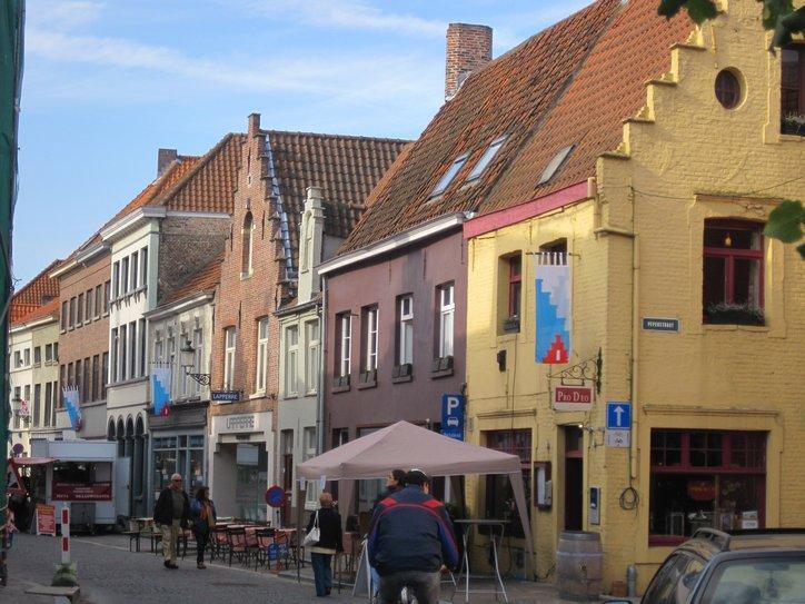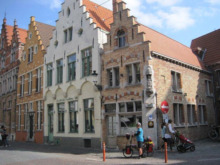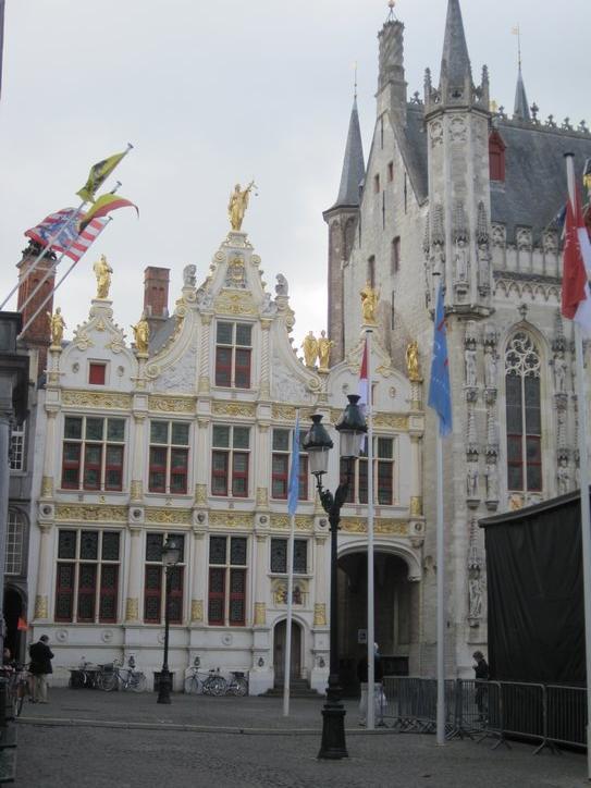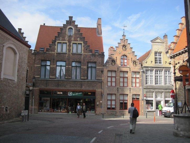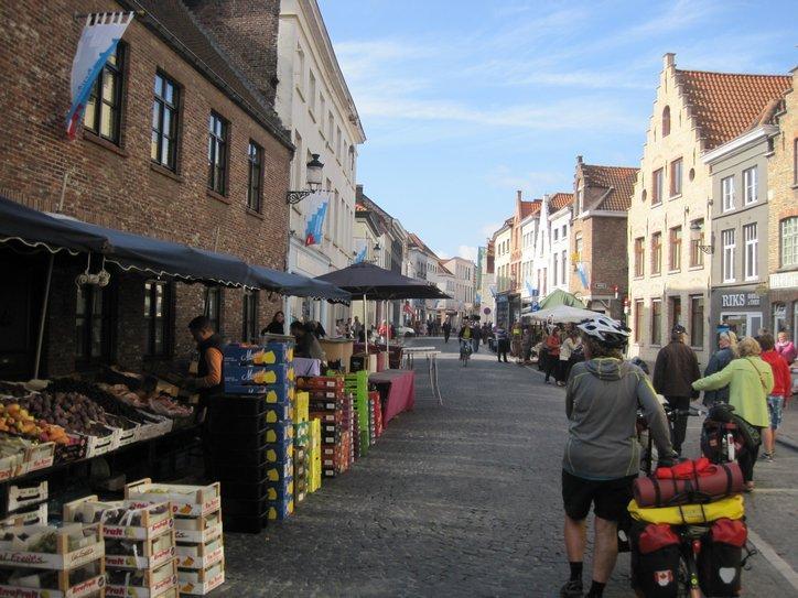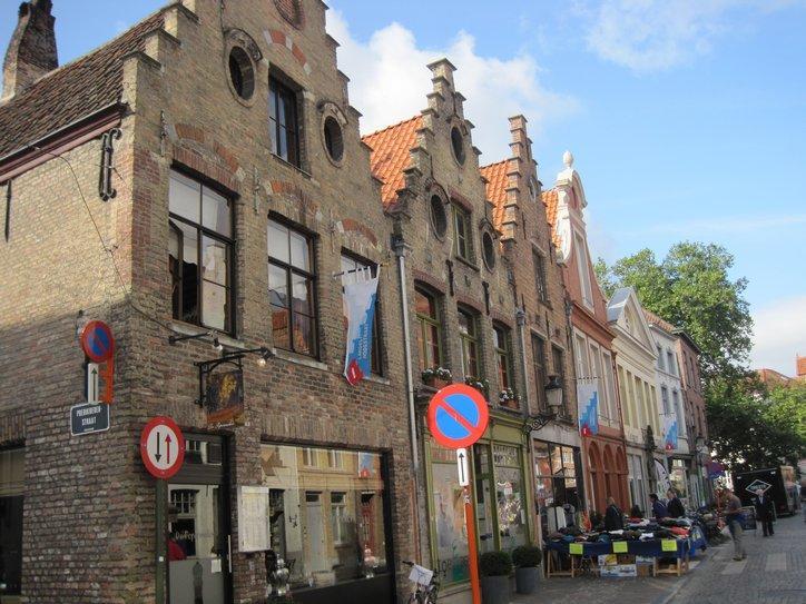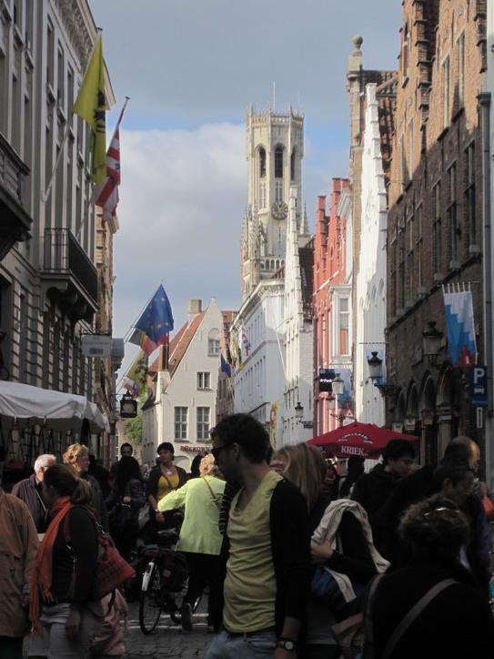 Passing through this gate was like entering another world. I often think that Walt Disney could not have dreamed up a more perfect city than some of the places we have been in. This was a place like that. The narrow cobbled street we started on was lined with unique and old buildings. Perhaps because it was Saturday, there were market tables and stalls along the way. No moving cars marred the experience. We soon came on a bakery, and bought a raisin bun, just for research purposes. Superb! Good bakery continues to mystify me. The same ingredients, more or less, can be turned to junk or to art depending on the skill of the baker. In Brugge, they have the skill.
