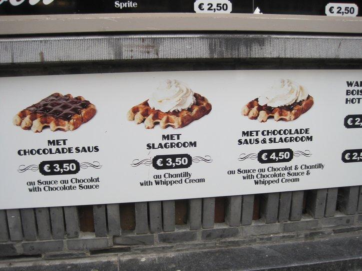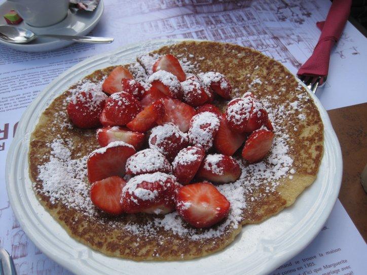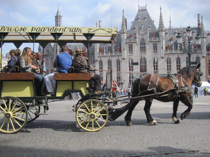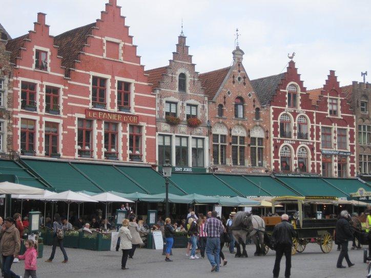 The next café was the Craenenburg. The building has been there from before 1305, and received its name from the family that lived there at that time. It has been a restaurant for the last 100 years. At the Craenenburg, it became clear again that we are back in the land of fine cuisine. Our dishes were superb. And we took a gamble and ordered pancake with strawberry. We got loads of fresh strawberries atop a perfectly made pancake, and sprinkled with powdered sugar. Then the cappuccinos – the whole thing was perfection, and we had it in the shadow of that huge tower, with caleches drawn by Belgian horses opposite, in front of the Palace!
