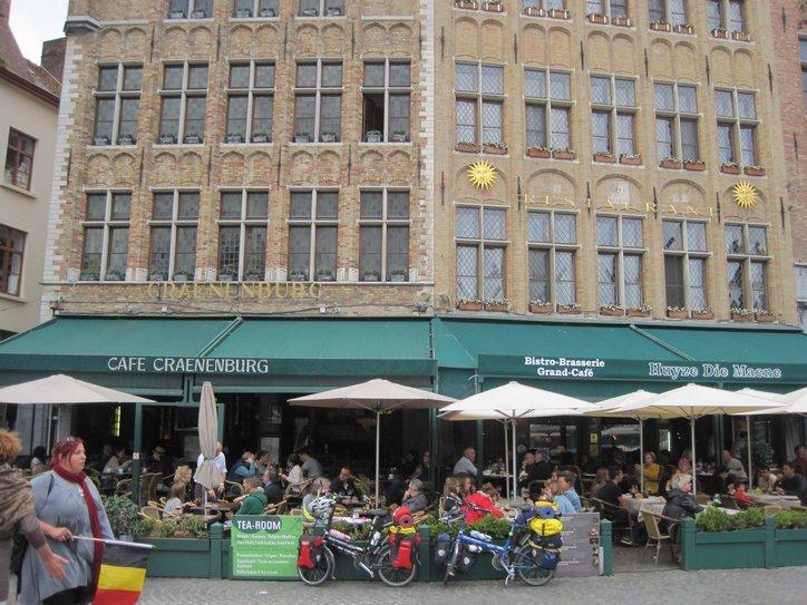 At the first one we chose, we placed our bikes near the tables and a waiter came and told us to put our bikes in the racks, somewhere across the street. He claimed we would be blocking car traffic where we had them. Since the road was closed to cars, we told him to go to hell, and moved to the next café.