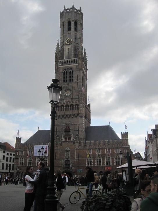 We took seats before a “throne”, with about thirty other people. An elderly woman appeared, and seated herself before the relic. She addressed the people in four languages, and as far as I could hear, spoke each perfectly. She invited anyone who wanted to come forward one by one, to touch the relic, and make any private prayer they wished. Dodie did, and reports that while she did not feel any specific spiritual emanations, she did feel the weight of years of belief. She came away moved by the experience. The wonders of the town continued to flow, as we finally entered the market square. On one side is the Church of Our Lady, with its enormously high gothic tower. This tower is higher (much higher) than the one in Damme or in Zierikzee. This time, though, we did not take the time to climb it.