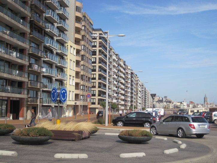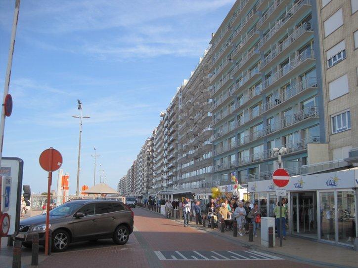 Our scheme was to take the shortest route to the coast in hopes of picking up the LF1a as soon as possible. We arrived there, at Blankenberge, to find quite a scene. The coast is lined with a solid row of apartment complexes, in front of which is a beach with restaurants, beach huts, and swarms of people. We wove our way through the people, making slow progress, and no sign of LF1a. Eventually we got on a road and used the bike path beside to head for Oostende, the next major town in the direction of Dunkirk. At one point we did find an LF sign, but soon one with an ambiguous direction arrow lead us away, and we continued beside a major road.