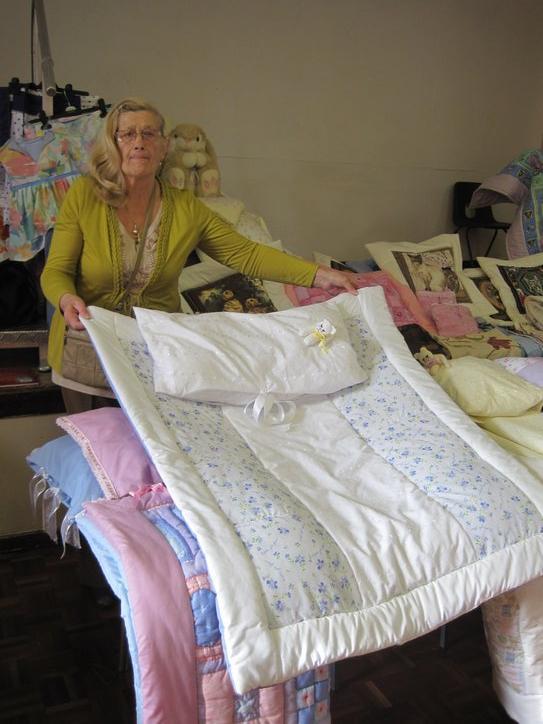 One of the tables was that of Patricia Deveson, a great grandmother quilt maker. She had one that seemed perfect for a new baby, with lacy bits and the words “la petite jolie fleur”, plus a knitted pussycat on the lacy included pillow. Too bulky, of course, to carry on the bikes, but we easily arranged to have her mail it to Montreal. Hopefully it will arrive at the same time as the new grand baby!