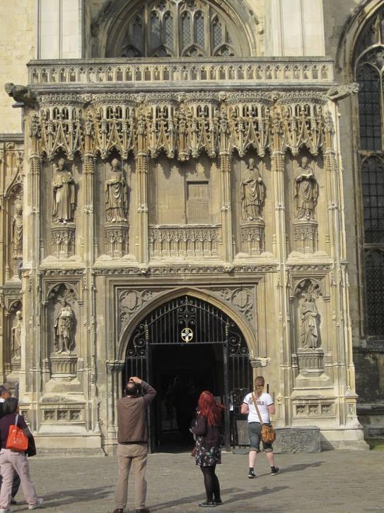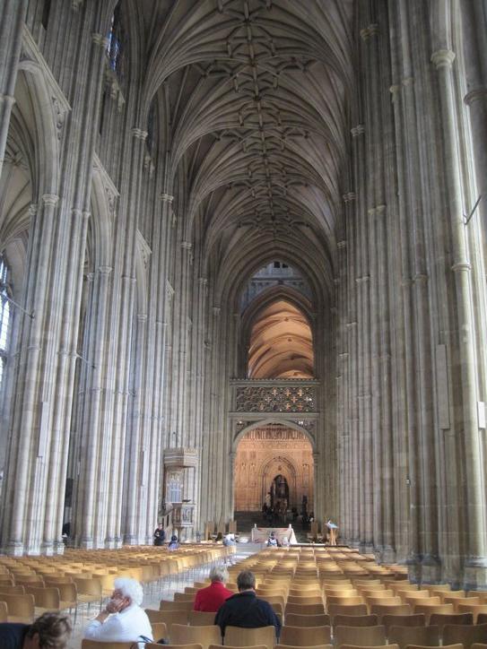 Canterbury Cathedral itself is in the centre of town, but not on the model of the European churches and cathedrals. In those cases, the church/cathedral fronts a square, usually a market square, and that square is the commercial and social centre of the town. Canterbury, though, is walled in by its own auxiliary buildings, and the compound is accessed through an elaborate gate. The commercial town is outside the gate. It took 8 ½ pounds each to get us through the gate, another contrast with the freely visitable Catholic churches on the continent.